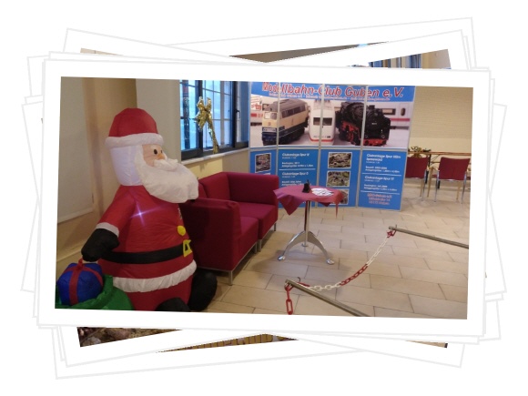 Den notwendigen Weihnachtsbaum samt Kugeln stellte Uwe zur Verfügung.Das in älteren Stuben meist übliche Wandbild wurde von unserer Informationswand übernommen. Gerd stellte aus seinen Privatbeständen eine alte Märklinbahn in HO zur Verfügung , die, auf dem Fußboden unter dem Weihnachtsbaum aufgebaut, reibungslos ihre Kilometer absolvierte. Unter dem Beistelltisch fanden die Allerkleinsten eine Holzeisenbahn zum spielen. Für die Leckermäuler unter den Kindern und Erwachsenen stand ein Teller mit Lebkuchen und Schokofiguren bereit.
